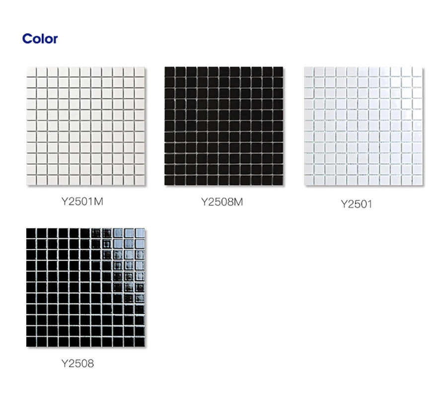 From material scale, we have porcelain in solid color and kiln pattern for your choice and also glass mosaic like crystal, colored