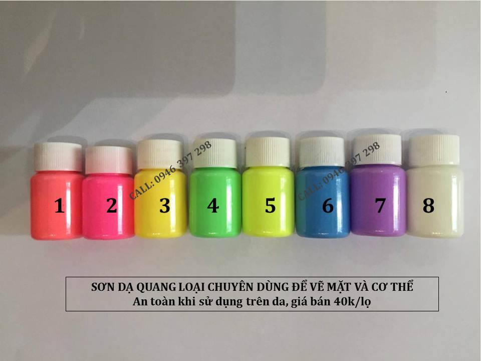 Sơn dạ quang vẽ mặt và cơ thể, dễ sử dụng, an toàn đối với hầu hết các loại da. Để sử dụng, các bạn phơi sáng sơn dưới ánh nắng hoặc ánh đèn tối thiểu 20-30 phút sau đó vẽ lên người, mặt, chân tay và chờ sơn khô. Bạn có thể pha thêm 1 chút nước hoặc sử dụng luôn. Sơn tẩy rửa dễ dàng bằng nước sạch.