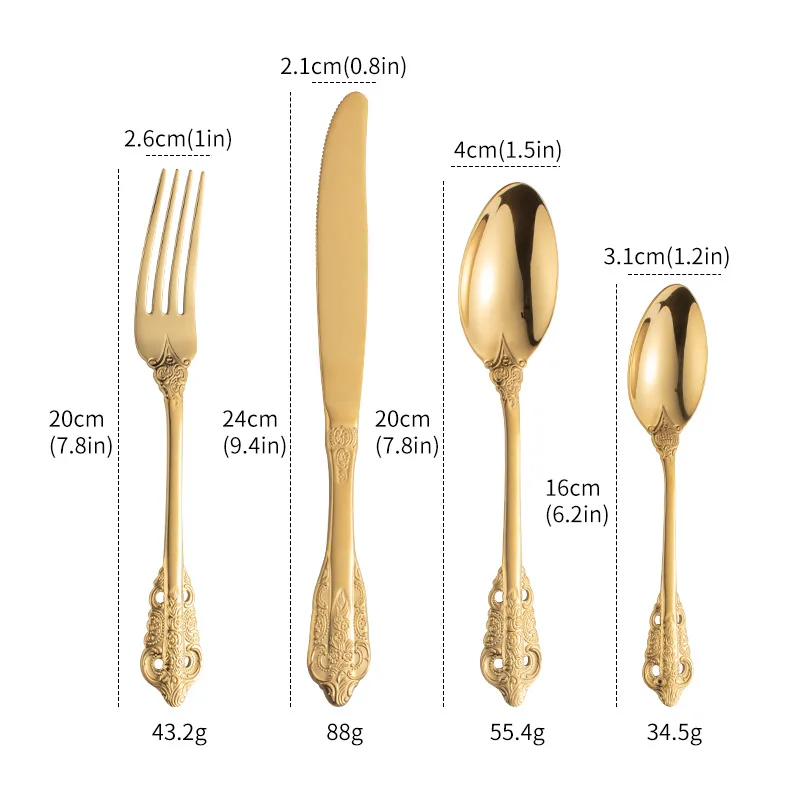 Stainless Steel 304 Royal Spoon Fork and Knife Silverware Wedding Golden Plated Retro Luxury Cutlery Set Gold Vintage Flatware