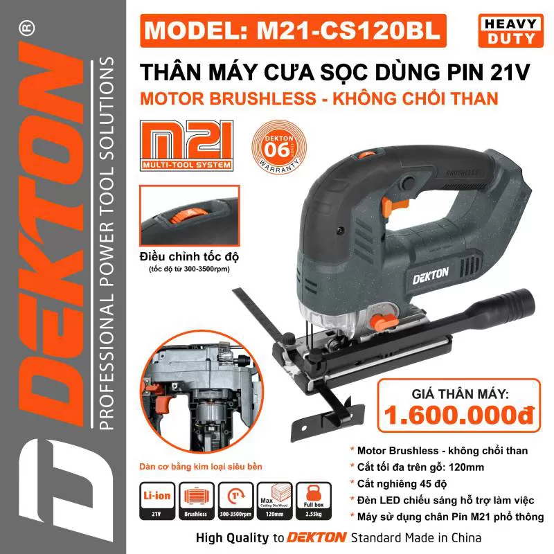 Dekton M21-CS120BL là mẫu cưa sọc dùng pin cực kỳ đáng mua trong phân khúc dưới 2 triệu đồng. Máy có động cơ không chổi than, khả năng cắt nghiêng 45 độ, điều chỉnh tốc độ và đèn LED chiếu sáng, đây là một trợ thủ đắc lực cho mọi công việc cắt gỗ, nhựa, kim loại mỏng trong thi công nội thất hoặc DIY tại nhà.