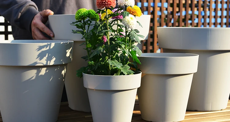A: Our pots for plants are made of high polymer environment-friendly composite materials. They are strong, light weight, and elegant.